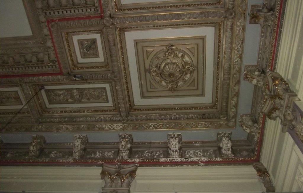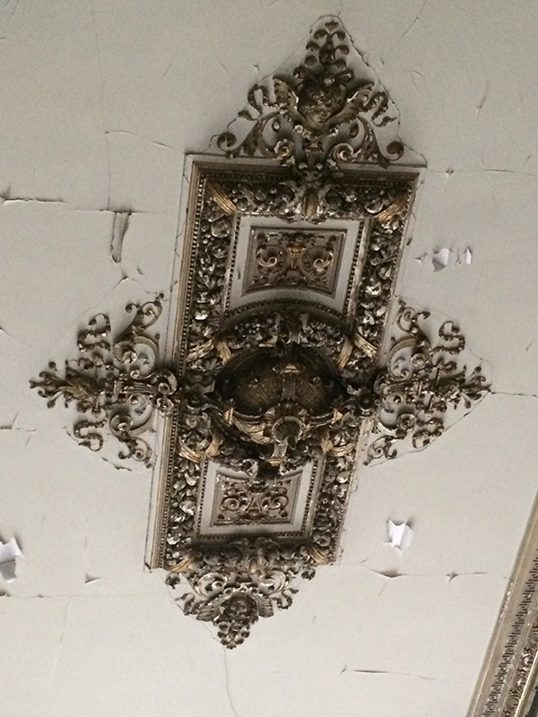 Decke im Salon – Raumecke, große Rosette mit hängenden Pinienzapfen